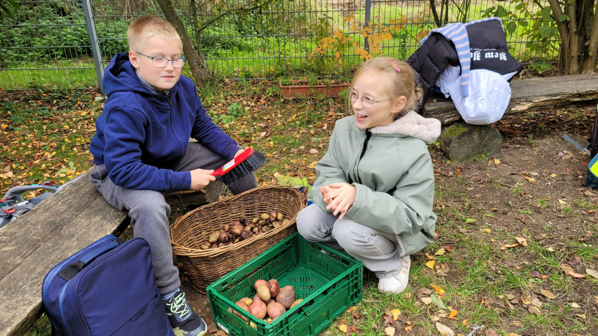 Im Frühjahr pflanzten die Klassen 3c und 3d mit Unterstützung des Programmes „Kids an die Knolle“ ihre ersten Kartoffeln im Acker. Im Herbst folgte nun eine gute Ernte, die in der Schulküche zu Ofenkartoffeln verarbeitet wurde, natürlich gewürzt mit dem selbstgemachten Rosmarinsalz. Weiterhin schrieben die Kinder erfolgreich Rezepte zum Beispiel für Kartoffelgerichte und beschäftigten sich auch mit zahlreichen anderen Themen rund um die tolle Knolle.
