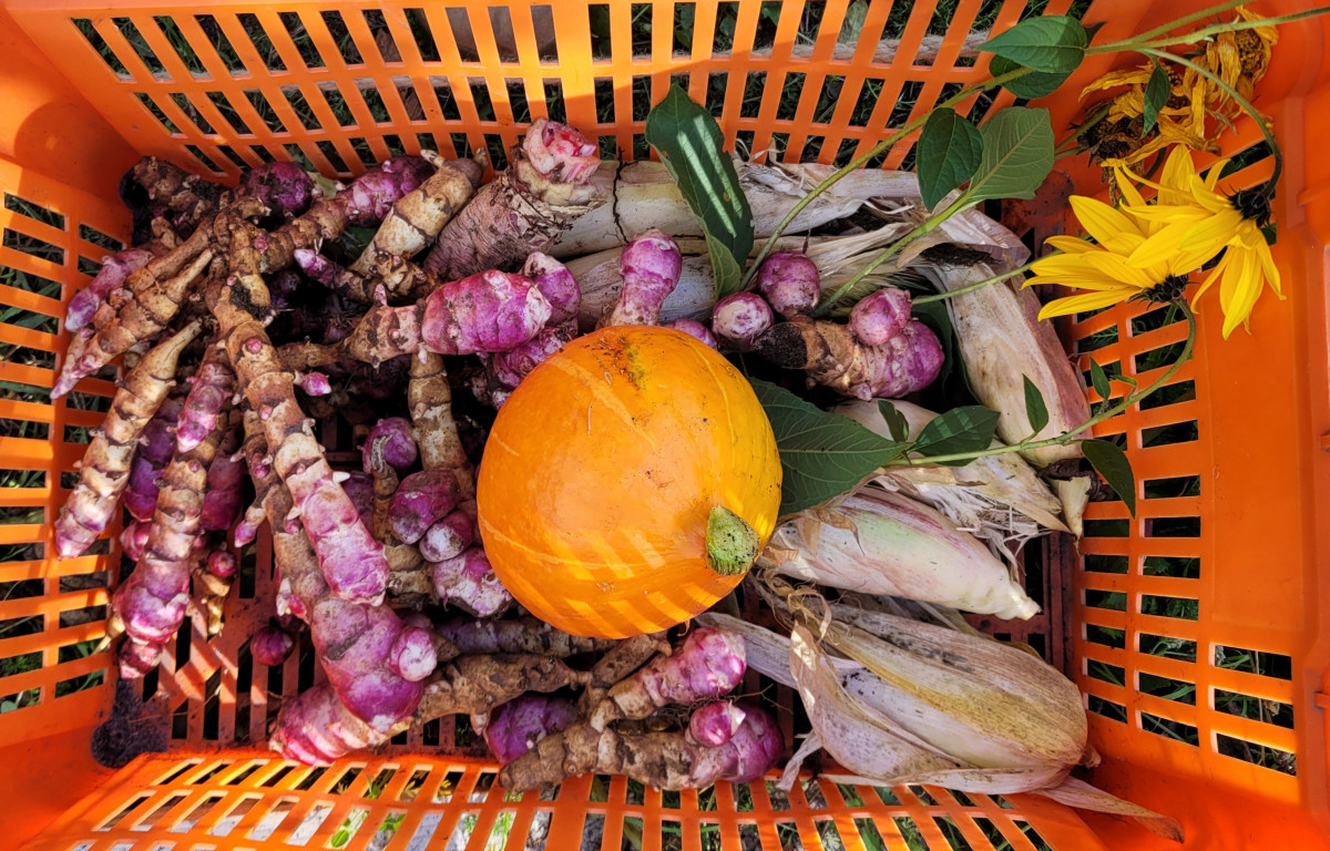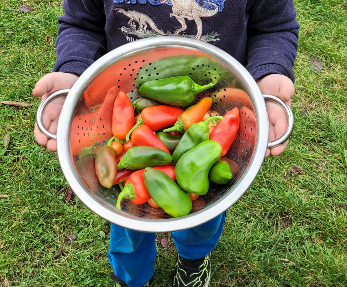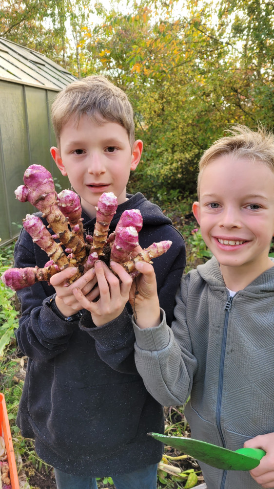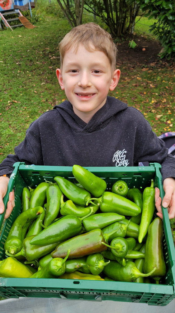 Dank des fleißigen Gießdienstes der Eltern und dem guten Wetter im Sommer konnte viel geerntet werden. Im Gewächshaus wuchsen die Tomatenpflanzen bis unter die Decke, gespendete und selbstgezogene Paprikas füllten einen ganzen Korb. Auch der Versuch Süßkartoffen und Physalis (Andenbeere) anzupflanzen war ein voller Erfolg. Zudem wurden Mais, Chilis, zahlreiches Obst (Äpfel, Birnen, Pflaumen), Beeren, Kräuter, Salat, Erbsen und überraschend Topinamur, welcher uns ins Staunen versetzte, geerntet, genascht, verteilt, zubereitet, künstlerisch genutzt und sehr wert geschätzt.