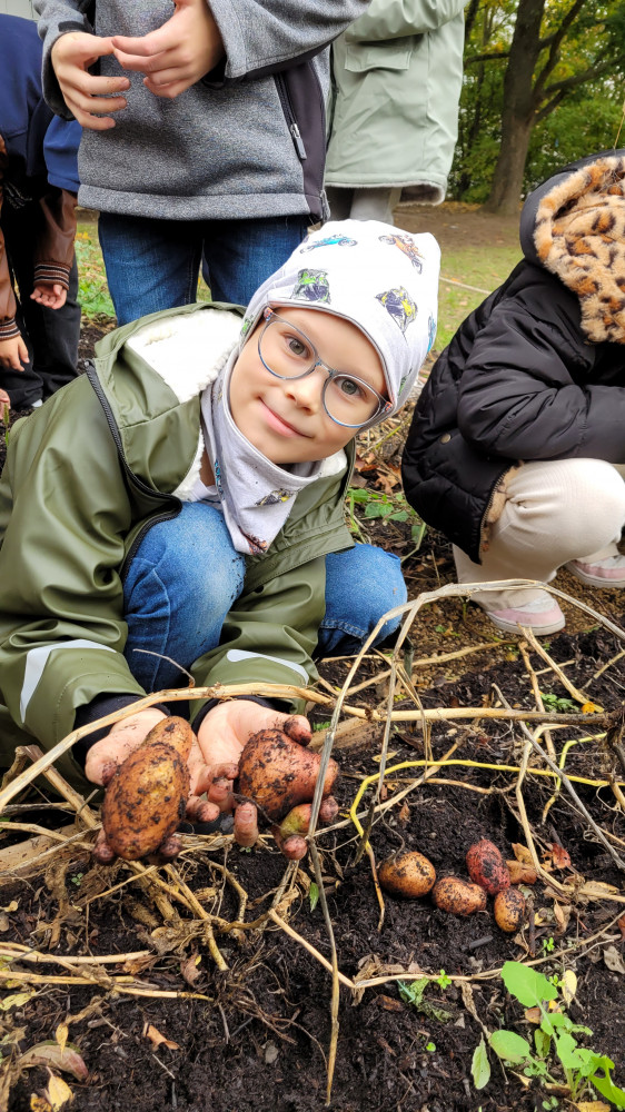 Im Frühjahr pflanzten die Klassen 3c und 3d mit Unterstützung des Programmes „Kids an die Knolle“ ihre ersten Kartoffeln im Acker. Im Herbst folgte nun eine gute Ernte, die in der Schulküche zu Ofenkartoffeln verarbeitet wurde, natürlich gewürzt mit dem selbstgemachten Rosmarinsalz. Weiterhin schrieben die Kinder erfolgreich Rezepte zum Beispiel für Kartoffelgerichte und beschäftigten sich auch mit zahlreichen anderen Themen rund um die tolle Knolle.