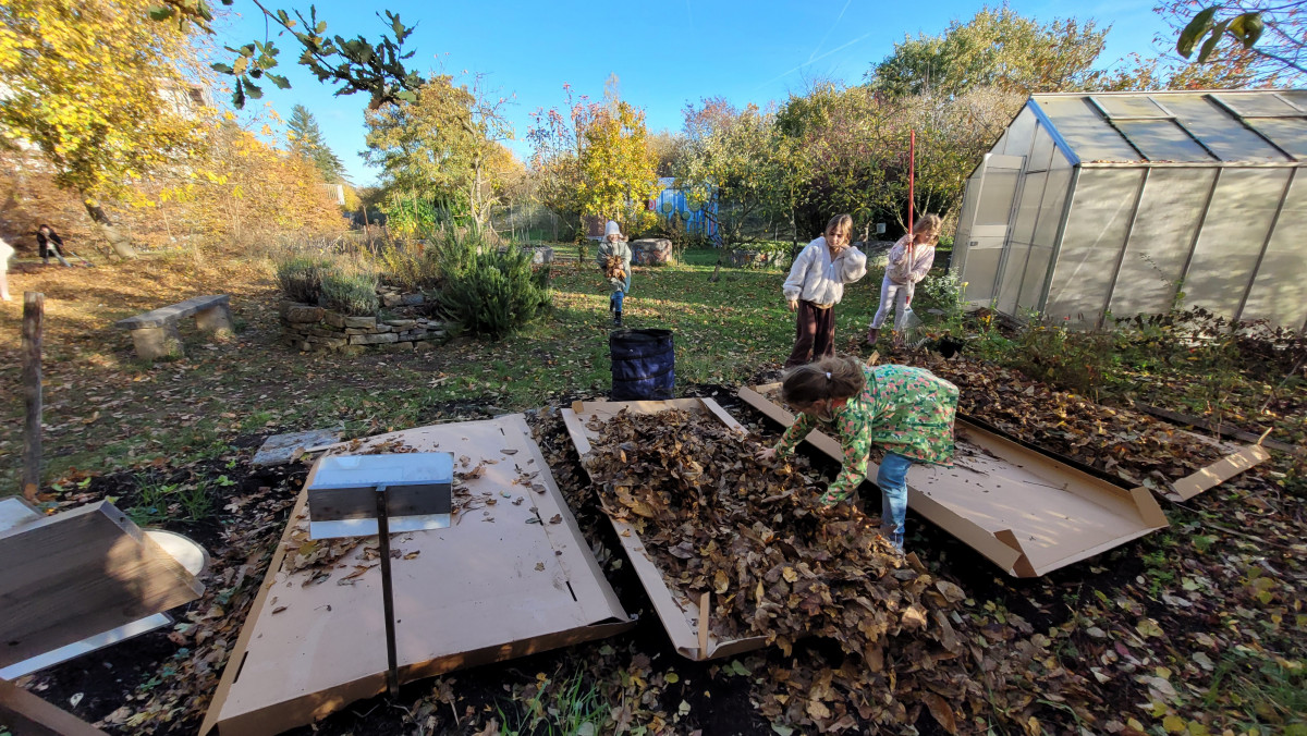 Zum Schluss hat die Garten AG den Acker mit Pappe und Laub bedeckt. So kann er seinen verdienten Winterschlaf halten und Kraft fürs nächste Jahr tanken.